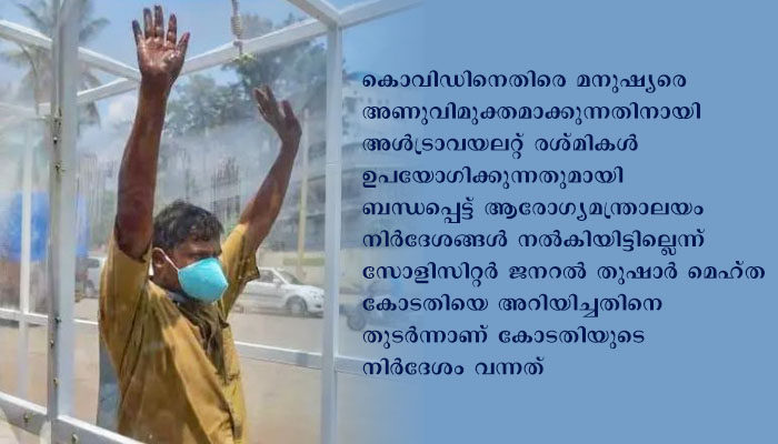 ഗുര്സിമ്രാന് സിങ് നറുല നല്കിയ പൊതുതാല്പര്യഹര്ജിയില് വാദം കേള്ക്കുകയായിരുന്നു സുപ്രീം കോടതി. സംസ്ഥാനങ്ങളും കേന്ദ്ര ഭരണപ്രദേശങ്ങളുമാണ് ആരോഗ്യമന്ത്രാലയത്തിന്റെ നിര്ദേശങ്ങള് നടപ്പാക്കേണ്ടതെന്നും സാമ്പത്തിക സഹായവും, നിര്ദേശങ്ങള് നല്കുന്നതിലുമായി സര്ക്കാറിന്റെ പങ്ക് പരിമിതപ്പെട്ടിരിക്കുന്നുവെന്നും കേന്ദ്രം വ്യക്തമാക്കിയിരുന്നു. ഡിസിന്ഫക്ടന്റ് ടണലുകള്, വിവിധ രാസവസ്തുക്കള്, അണുനാശിനി തളിക്കള് എന്നിവയുടെ ഉപയോഗവും ഫലപ്രാപ്തിയും വിശകലനം ചെയ്യുന്നതിനായി ആരോഗ്യ ഡയറക്ടര് ജനറലിന്റെ കീഴില് ജൂണ് 9ന് ഉന്നതതല യോഗം നടത്തിയിരുന്നുവെന്നും കേന്ദ്രത്തിന്റെ സത്യവാങ്മൂലത്തില് പറയുന്നു.