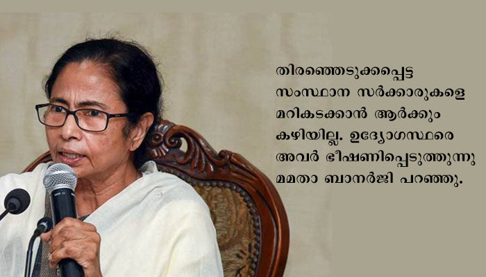 ” കേന്ദ്ര ഏജൻസികളിലൂടെ സംസ്ഥാനങ്ങളിൽ അസ്വസ്ഥത സൃഷ്ടിക്കാനാണ് ബി ജെ പിയുടെ ശ്രമം. തിരഞ്ഞെടുക്കപ്പെട്ട സംസ്ഥാന സർക്കാരുകളെ മറികടക്കാൻ ആർക്കും കഴിയില്ല. ഉദ്യോഗസ്ഥരെ അവർ ഭീഷണിപ്പെടുത്തുന്നു” മമതാ ബാനർജി പറഞ്ഞു.