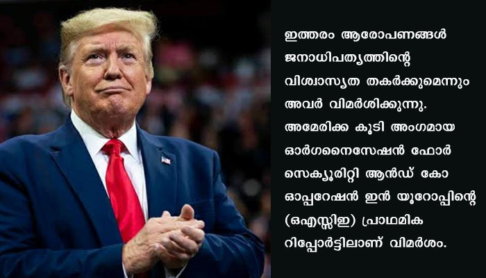 തെളിവില്ലാതെ ട്രംപ് ഉയര്ത്തിയ ആരോപണം ജനങ്ങളിലും തെരഞ്ഞെടുപ്പ് ഉദ്യോഗസ്ഥരിലും ആശയക്കുഴപ്പമുണ്ടാക്കി. വോട്ടെണ്ണല് പൂര്ത്തിയായിട്ടില്ല. വോട്ടെടുപ്പ്, വോട്ടെണ്ണല് ഇവയെല്ലാം നിയമാനുസൃതംതന്നെ നടക്കണം. തെരഞ്ഞെടുപ്പ് രാത്രിയില്പ്പോലും പ്രസിഡന്റ് വ്യാജ ആരോപണങ്ങള് ഉയര്ത്തുന്നത് ജനാധിപത്യ സംവിധാനത്തെ തകര്ക്കും. തപാല് വോട്ടുകളുടെ വിശ്വാസ്യതയെ ട്രംപ് ചോദ്യം ചെയ്തിരുന്നു. എന്നാല്, വളരെ ചുരുക്കം വോട്ടുകളില്മാത്രമാണ് കുഴപ്പം കണ്ടതെന്നും റിപ്പോര്ട്ടില് പറയുന്നു. യുഎസ് തെരഞ്ഞെടുപ്പിനായി 102 നിരീക്ഷകരെയാണ് ഒഎസ്സിഇ നിയോഗിച്ചത്.