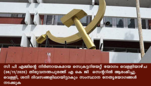 തിരുവനന്തപുരം: സ്വർണക്കടത്തിലും ലൈഫ് മിഷനിലും ഏറ്റവും ഒടുവിൽ മയക്കുമരുന്നു കേസിലും പാർട്ടിയും സർക്കാരും വെട്ടിലായ സാഹചര്യത്തിൽ സി പി എമ്മിന്റെ നിർണായകമായ സെക്രട്ടറിയേറ്റ് യോഗം വെളളിയാഴ്ച (06/11/2020) തിരുവനന്തപുരത്ത് എ കെ ജി സെന്ററിൽ ആരംഭിച്ചു. വെള്ളി, ശനി ദിവസങ്ങളിലായിട്ടാകും സംസ്ഥാന നേതൃയോഗങ്ങൾ നടക്കുക.
