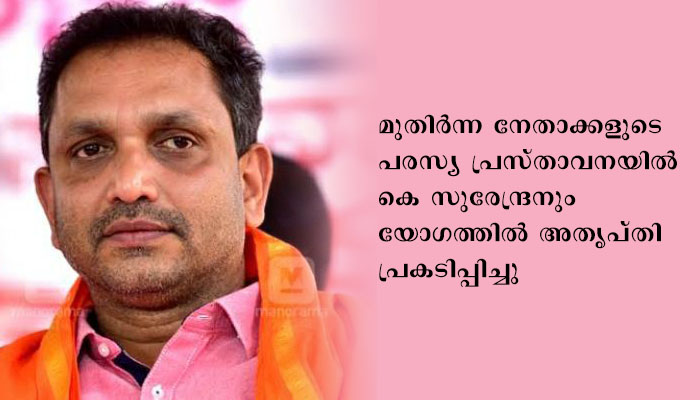 മുതിര്ന്ന നേതാക്കളുടെ പരസ്യ പ്രസ്താവനയില് കെ സുരേന്ദ്രനും യോഗത്തിൽ അതൃപ്തി പ്രകടിപ്പിച്ചു. അസംതൃപ്തരുമായി ബിജെപി സംസ്ഥാന നേതൃത്വം ചര്ച്ച നടത്തണമെന്നും യോഗത്തിൽ നിർദേശമുണ്ടായി . ബിജെപി സംസ്ഥാന അധ്യക്ഷന് കെ സുരേന്ദ്രന്, സംഘടനാ സെക്രട്ടറി എം ഗണേശന്, ആര്എസ്എസ് നേതാക്കളായ എം രാധാകൃഷ്ണന്, ഹരികൃഷ്ണന്, സുദര്ശന് തുടങ്ങിയവര് യോഗത്തില് പങ്കെടുത്തു.