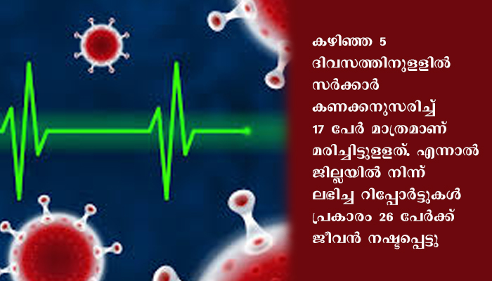 മരിച്ചവരെല്ലാം കോവിഡ് രോഗികളാണെന്ന് സ്ഥിരീകരിക്കുന്ന റിപ്പോര്ട്ടുകള് ലഭിച്ചിട്ടുണ്ടെങ്കിലും സര്ക്കാര് കണക്കില് ഇതൊന്നും ഉള്പ്പെടുത്തിയിട്ടില്ല. എല്ലാവരുടേയും സംസ്കാരം നടത്തിയിരിക്കുന്നതും കോവിഡ് പ്രോട്ടോക്കോള് അനുസരിച്ചുതന്നെയാണ്. കഴിഞ്ഞ 5 ദിവസത്തിനുളളില് സര്ക്കാര് കണക്കനുസരിച്ച് 17 പേര് മാത്രമാണ് മരിച്ചിട്ടുളളത്. എന്നാല് ജില്ലയില് നിന്ന് ലഭിച്ച റിപ്പോര്ട്ടുകള് പ്രകാരം 26 പേര്ക്ക് ജീവന് നഷ്ടപ്പെട്ടു.