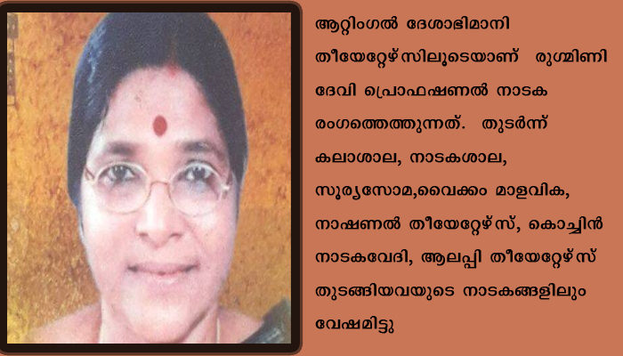 കൊച്ചി: ആറ് പതിറ്റാണ്ടുകളായി നാടക രംഗത്തെ നിറസാന്നിദ്ധ്യമായിരുന്ന ചോറ്റാനിക്കര രുഗ്മിണി ദേവി (75) ഓര്മ്മയായി. ചോറ്റാനിക്കര കടുകമംഗലത്തെ വാടക വീട്ടില് മരിച്ച നിലയില് കണ്ടെത്തുകയായിരുന്നു. ശനിയാഴ്ച (7/11/2020) രാവിലെ 8 മണിയോടെ വീട്ടുടമ വിവരമറിയച്ചതനുസരിച്ച് പോലീസ് എത്തി മേല് നടപടികള് സ്വീകരിച്ചശേഷം മൃതദേഹം തൃപ്പൂണിത്തുറ താലൂക്ക് ആശുപത്രിയിലേക്ക് മാറ്റി.