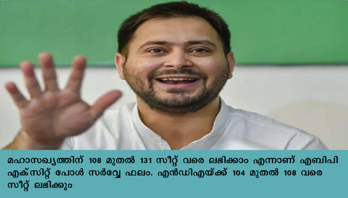 മഹാസഖ്യത്തിന് 108 മുതല് 131 സീറ്റ് വരെ ലഭിക്കാം എന്നാണ് എബിപി എക്സിറ്റ് പോള് സര്വ്വേ ഫലം. എന്ഡിഎയ്ക്ക് 104 മുതല് 108 വരെ സീറ്റ് ലഭിക്കും.