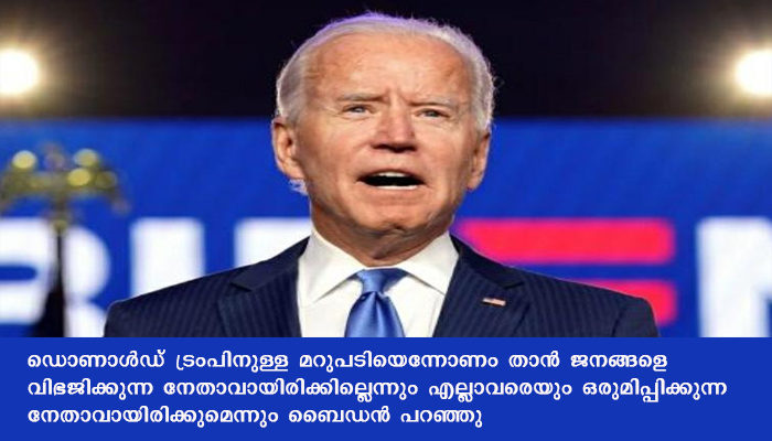 വിൽമിങ്ടൺ: താൻ ജനങ്ങളെ വിഭജിക്കുന്ന നേതാവായിരിക്കില്ലെന്ന് വിജയാഹ്ലാദ റാലിയെ അഭിസംബോധന ചെയ്ത് ജോ ബൈഡൻ. അമേരിക്കൻ സമയം നവംബർ 07 ശനിയാഴ്ച വൈകിട്ട് 6.15 ( ഇന്ത്യൻ സമയം നവംബർ 8 ഞായറാഴ്ച രാവിലെ ) നാണ് ജോ ബൈഡൻ ജനങ്ങളെ അഭിസംബോദന ചെയ്തത്.
