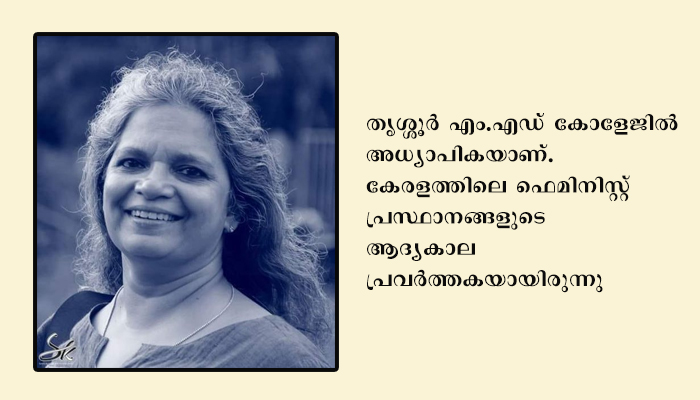തൃശൂരിലെ ചേതന എന്ന സ്ത്രീവാദി സംഘത്തിന് നേതൃത്വം നല്കിയവരില് പ്രധാനിയുമാണ്. നാടക- സിനിമ പ്രവര്ത്തകനായ കെ.സി സന്തോഷ് കുമാറാണ് ഭര്ത്താവ്.