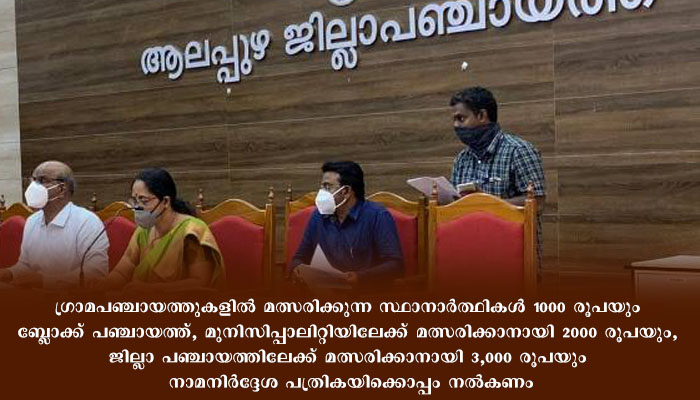 ആലപ്പുഴ: അടുത്ത മാസം നടക്കാനിരിക്കുന്ന തദ്ദേശ സ്വയംഭരണ സ്ഥാപനങ്ങളിലേക്കുള്ള തിരഞ്ഞെടുപ്പിന് മുന്നോടിയായി വിവിധ രാഷ്ട്രീയ പാര്‍ട്ടി പ്രതിനിധികളുടെ ആദ്യഘട്ട ജില്ലാതല സ്റ്റാന്റഡിംഗ് കമ്മിറ്റി യോഗം ചേര്‍ന്നു. ജില്ല തിരഞ്ഞെടുപ്പ് ഉദ്യോഗസ്ഥന്‍ കൂടിയായ ജില്ല കളക്ടര്‍ എ അലക്‌സാണ്ടറുടെ അധ്യക്ഷതയില്‍ ജില്ലാ പഞ്ചായത്ത് ഹാളിലാണ് യോഗം ചേര്‍ന്നത്. കോവിഡ് പ്രോട്ടോക്കോള്‍ പാലിച്ച് വേണം തിരഞ്ഞെടുപ്പ് പ്രചാരണം ഉള്‍പ്പടെയുള്ളവ നടത്താനെന്ന് ജില്ല കളക്ടര്‍ നിര്‍ദ്ദേശിച്ചു. ജില്ലയില്‍ ആറ് മുനിസിപ്പാലിറ്റികളിലായി 282 പോളിംഗ് സ്റ്റേഷനുകളും 72 ഗ്രാമപഞ്ചായത്തുകളിലായി 1989 പോളിംഗ് സ്റ്റേഷനുകളുമാണ് നിലവിലുള്ളത്. ഗ്രാമപഞ്ചായത്തുകളില്‍ മത്സരിക്കുന്ന സ്ഥാനാര്‍ത്ഥികള്‍ 1000 രൂപയും ബ്ലോക്ക് പഞ്ചായത്ത്, മുനിസിപ്പാലിറ്റിയിലേക്ക് മത്സരിക്കാനായി 2000 രൂപയും, ജില്ലാ പഞ്ചായത്തിലേക്ക് മത്സരിക്കാനായി 3,000 രൂപയും നാമനിര്‍ദ്ദേശ പത്രികയിക്കൊപ്പം നല്‍കണം.