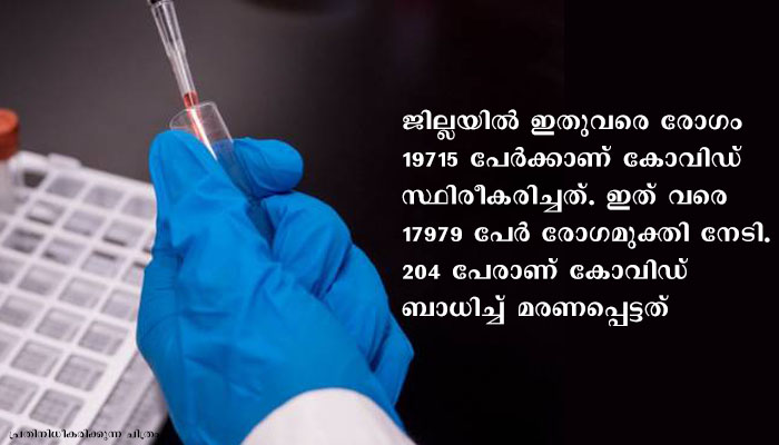ജില്ലയില് ഇതുവരെ രോഗം 19715 പേര്ക്കാണ് കോവിഡ് സ്ഥിരീകരിച്ചത്. ഇത് വരെ 17979 പേര് രോഗമുക്തി നേടി. 204 പേരാണ് കോവിഡ് ബാധിച്ച് മരണപ്പെട്ടത്. നിലവില് 1532 പേരാണ് ചികിത്സയിലുള്ളത്. സെന്റിനല് സര്വ്വേ അടക്കം 1090 സാമ്പിളുകളാണ് പരിശോധനയ്ക്കയച്ചത്.ഇതോടെ ഇതുവരെ പരിശോധനയ്ക്ക് അയച്ച സാമ്പിളുകളുടെ എണ്ണം 137432 ആയി.