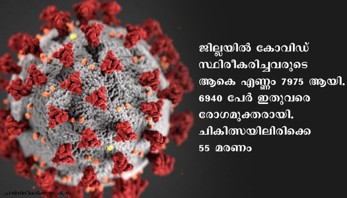 ഇതോടെ ജില്ലയില് കോവിഡ് സ്ഥിരീകരിച്ചവരുടെ ആകെ എണ്ണം 7975 ആയി. 6940 പേര് ഇതുവരെ രോഗമുക്തരായി. ചികിത്സയിലിരിക്കെ 55 മരണം. നിലവില് 964 പേരാണ് ചികിത്സയിലുള്ളത്. ഇവരില് 432 പേര് വീടുകളിലാണ് ഐസൊലേഷനില് കഴിയുന്നത്.