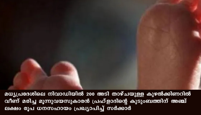 ഭോപ്പാല്: മധ്യപ്രദേശിലെ നിവാഡിയില് 200 അടി താഴ്ചയുള്ള കുഴല്ക്കിണറില് വീണ് മരിച്ച മൂന്നുവയസുകാരന് പ്രഹ്ളാദിന്റെ കുടുംബത്തിന് അഞ്ച് ലക്ഷം രൂപ ധനസഹായം പ്രഖ്യാപിച്ച് സര്ക്കാര്. സംസ്ഥാനത്തെ എല്ലാവരും കുട്ടിയുടെ കുടുംബത്തിനൊപ്പമുണ്ടെന്നും ഇനി സംസ്ഥാനത്ത് ആരും കുഴല്ക്കിണറുകള് തുറന്നുവെക്കരുതെന്നും ധനസഹായം പ്രഖ്യാപിക്കുമ്പോള് മുഖ്യമന്ത്രി ശിവരാജ് സിംഗ് ചൗഹാന് പറഞ്ഞു. 90 മണിക്കൂര് നീണ്ട പ്രയത്നത്തിനൊടുവിലും കുട്ടിയെ രക്ഷിക്കാന് കഴിയാത്തതില് മുഖ്യമന്ത്രി ദുഖം രേഖപ്പെടുത്തി.