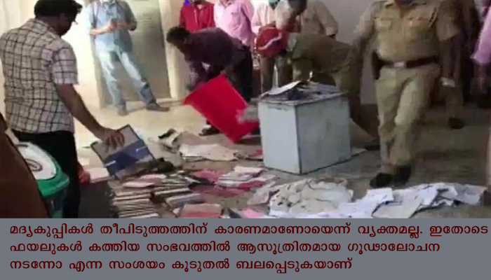 തീപിടിത്തം നടന്നിടത്തു നിന്ന് രണ്ട് മദ്യകുപ്പികള് കണ്ടെത്തിയിട്ടുണ്ട്. മദ്യകുപ്പികള് തീപിടുത്തത്തിന് കാരണമാണോയെന്ന് വ്യക്തമല്ല. ഇതോടെ ഫയലുകള് കത്തിയ സംഭവത്തിൽ ആസൂത്രിതമായ ഗൂഢാലോചന നടന്നോ എന്ന സംശയം കൂടുതൽ ബലപ്പെടുകയാണ് . ഫാനിന്റെ കത്തിയ ഭാഗങ്ങള്, ഉരുകിയ ഭാഗങ്ങള്, മോട്ടര് എന്നിവ പരിശോധിച്ചിരുന്നു. തീപിടിത്തതിന് കാരണം വ്യക്തമാകാത്തതിനാല് വിദഗ്ധ ഫോറന്സിക് പരിശോധന വീണ്ടും നടത്താന് ആലോചനയുണ്ട്. സാമ്പിള് ബംഗ്ളൂരുവിലോ കൊച്ചിയിലോ അയക്കാനാണ് തീരുമാനം.