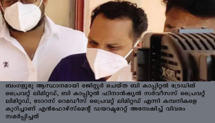 ബംഗളൂരു ആസ്ഥാനമായി രജിസ്റ്റര് ചെയ്ത ബി കാപ്പിറ്റല് ട്രേഡിങ് പ്രൈവറ്റ് ലിമിറ്റഡ്, ബി കാപ്പിറ്റല് ഫിനാന്ഷ്യല് സര്വീസസ് പ്രൈവറ്റ് ലിമിറ്റഡ്, ടോറസ് റെമഡീസ് പ്രൈവറ്റ് ലിമിറ്റഡ് എന്നി കമ്പനികളെ കുറിച്ചാണ് എന്ഫോഴ്സ്മെന്റ് ഡയറക്ടറേറ്റ് അന്വേഷിച്ച് വിവരം സമർപ്പിച്ചത്.പ്രാഥമിക അന്വേഷണത്തില് ഇതെല്ലാം കടലാസ് കമ്പനികളാണെന്ന് ബോധ്യപ്പെട്ടിട്ടുണ്ടെന്നാണ് ഇ.ഡി കോടതിയില് അറിയിച്ചത്. ഈ കമ്പനികള് വഴി കള്ളപ്പണം വെളുപ്പിക്കല് നടന്നിട്ടുണ്ടോ എന്ന് ഇ.ഡി അന്വേഷിയ്ക്കും.