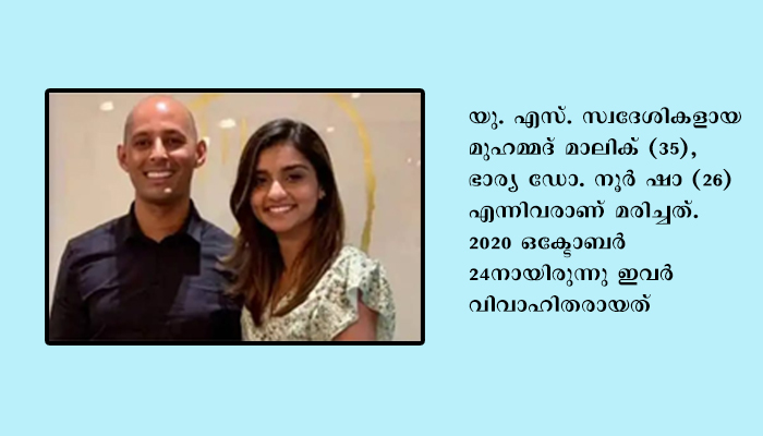 യു.എസ്. സ്വദേശികളായ മുഹമ്മദ് മാലിക് (35), ഭാര്യ ഡോ. നൂര് ഷാ (26) എന്നിവരാണ് മരിച്ചത്. 2020 ഒക്ടോബര് 24നായിരുന്നു ഇവർ വിവാഹിതരായത്.