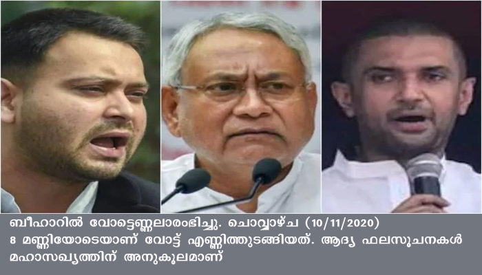 പട്ന: ബീഹാറില് വോട്ടെണ്ണലാരംഭിച്ചു. ചൊവ്വാഴ്ച (10/11/2020) 8 മണ്ണിയോടെയാണ് വോട്ട് എണ്ണിത്തുടങ്ങിയത്. ആദ്യ ഫലസൂചനകൾ മഹാസഖ്യത്തിന് അനുകൂലമാണ്.
