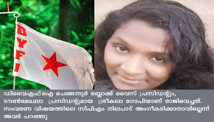 അതേസമയം കുറെനാളുകളായി ശ്രീകല ഗോപി സംഘടനയില് സജീവമായിരുന്നി്ല്ലെന്നാണ് സിപിഎം കേന്ദ്രങ്ങള് പറയുന്നത്. രാജി ഒഴിവാക്കാന് ശ്രീകലയുടെമേല് സിപിഎം,ഡിവൈഎഫ്ഐ നേതൃത്വങ്ങള് കടുത്ത സമ്മര്ദ്ദം ആരംഭിച്ചിട്ടുണ്ട്.