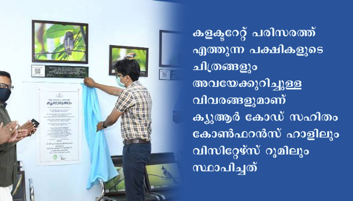 കളക്ടറേറ്റ് കോമ്പൗണ്ടില് നിന്ന് മാത്രം പകര്ത്തിയ ചിത്രങ്ങളാണ് ഇവിടെ സ്ഥാപിച്ചിട്ടുള്ളത്. അഞ്ചുമാസം കൊണ്ട് ശേഖരിച്ച വ്യത്യസ്ഥങ്ങളായ 30 പക്ഷികളുടെ ചിത്രങ്ങളാണ് കളക്ടറേറ്റില് എത്തുന്ന സന്ദര്ശകരെ സ്വീകരിക്കുന്നത്. ചെറിയ പരിസരത്തുനിന്നു മാത്രം ഇത്രയും വൈവിധ്യമാര്ന്ന ചിത്രങ്ങള് പകര്ത്താന് കഴിയുമെങ്കില് നമ്മുടെ നാടിന്റെ ജൈവവൈവിധ്യം എത്രയായിരിക്കുമെന്ന് ചിന്തിപ്പിക്കുകയാണ് ഈ ചിത്രങ്ങളെന്ന് ജില്ലാ കളക്ടര് പി. ബി. നൂഹ് പറഞ്ഞു. നമ്മുടെ നിലനില്പ്പിന് നമ്മുടെ ചുറ്റുമുള്ള ഈ ജൈവവൈവിധ്യവും സംരക്ഷിക്കപ്പെടേണ്ടതുണ്ട്. സംരക്ഷിക്കണമെങ്കില് അവയെ ആദ്യം നാം തിരിച്ചറിയണം. നമുക്ക് ചുറ്റുമുളള ജൈവവൈവിധ്യത്തിന് ഒത്തുചേര്ന്ന് കൂടൊരുക്കണമെന്നു ജില്ലാ കളക്ടര് പറഞ്ഞു.