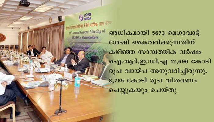 കഴിഞ്ഞ ദിവസം ന്യൂഡല്ഹി ഇന്ത്യ ഇന്റര്നാഷണല് സെന്ററില് നടന്ന വാര്ഷിക പൊതുയോഗം കഴിഞ്ഞ സാമ്പത്തിക വര്ഷത്തിലെ കണക്കുകള്ക്ക് അംഗീകാരം നല്കി. ഐ.ആര്.ഇ.ഡി.എ-യുടെ 33-ാമത് വാര്ഷിക പൊതുയോഗമാണ് ഇന്നലെ നടന്നത്.