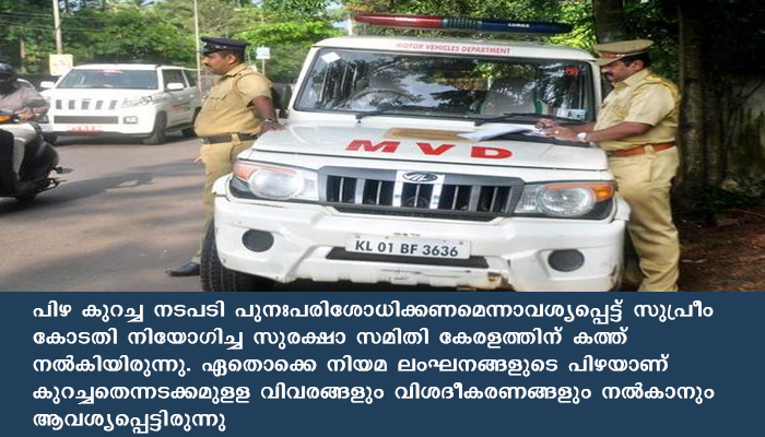 പിഴ കുറച്ച നടപടി പുനഃപരിശോധിക്കണമെന്നാവശ്യപ്പെട്ട് സുപ്രീം കോടതി നിയോഗിച്ച സുരക്ഷാ സമിതി കേരളത്തിന് കത്ത് നൽകിയിരുന്നു. ഏതൊക്കെ നിയമ ലംഘനങ്ങളുടെ പിഴയാണ് കുറച്ചതെന്നടക്കമുളള വിവരങ്ങളും വിശദീകരണങ്ങളും നല്കാനും ആവശ്യപ്പെട്ടിരുന്നു. ഇക്കാര്യം ഗതാഗത കമ്മീഷണറുമായി മന്ത്രി എ കെ ശശീന്ദ്രന് ചര്ച്ച ചെയ്ത ശേഷമാണ് മറുപടി നല്കിയത്.