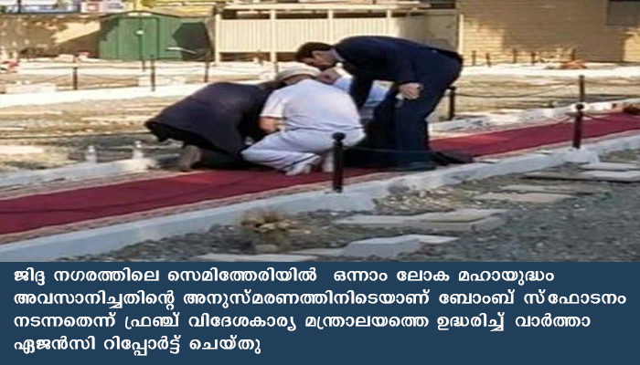 മനാമ: സൗദിയില് ഫ്രഞ്ച് കോണ്സുലേറ്റ് ഉദ്യോഗസ്ഥര് പങ്കെടുത്ത ചടങ്ങിനുനേരെയുണ്ടായ ബോംബ് ആക്രമണത്തില് ഗ്രീക്ക് ഉദ്യോഗസ്ഥന് ഉള്പ്പെടെ നാല് പേര്ക്ക് പരിക്കേറ്റു. ജിദ്ദ നഗരത്തിലെ സെമിത്തേരിയിൽ ഒന്നാം ലോക മഹായുദ്ധം അവസാനിച്ചതിന്റെ അനുസ്മരണത്തിനിടെയാണ് ബോംബ് സ്ഫോടനം നടന്നതെന്ന് ഫ്രഞ്ച് വിദേശകാര്യ മന്ത്രാലയത്തെ ഉദ്ധരിച്ച് വാർത്താ ഏജന്സി റിപ്പോര്ട്ട് ചെയ്തു.