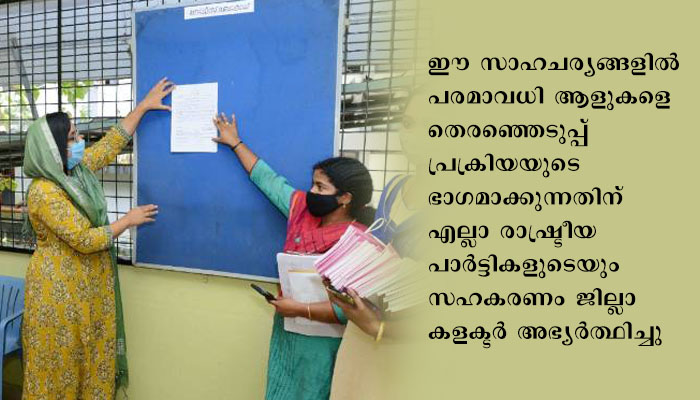 കോവിഡ് പ്രതിസന്ധിയില് പൊതുജനങ്ങള് വോട്ട് ചെയ്യാന് വിമുഖത കാണിക്കുന്ന സാഹചര്യം ഉണ്ടാവാന് പാടില്ല. എല്ലാവരെയും പോളിങ് ബൂത്തുകളില് എത്തിക്കാന് കഴിയണം. ഈ സാഹചര്യങ്ങളില് പരമാവധി ആളുകളെ തെരഞ്ഞെടുപ്പ് പ്രക്രിയയുടെ ഭാഗമാക്കുന്നതിന് എല്ലാ രാഷ്ട്രീയ പാര്ട്ടി പാര്ട്ടികളുടെയും സഹകരണം ജില്ലാ കളക്ടര് അഭ്യര്ത്ഥിച്ചു.