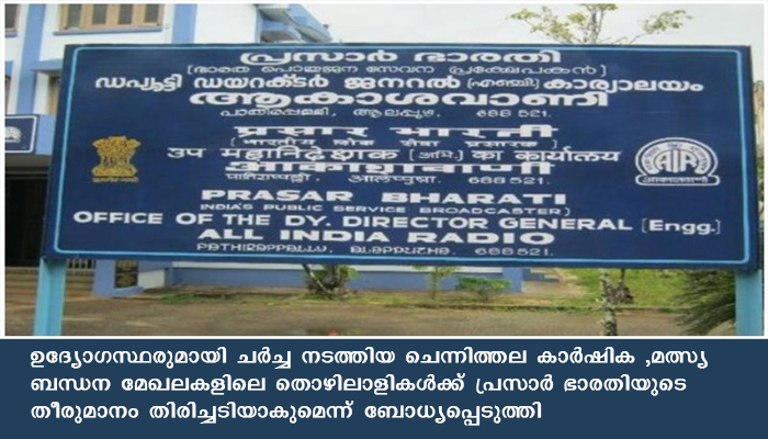 വ്യാഴാഴ്ച(12/11/2020) വൈകിട്ട് കലവൂരിലെ ആകാശവാണി നിലയം സന്ദര്ശിച്ച പ്രതിപക്ഷ നേതാവ് രമേശ് ചെന്നിത്തലയും പ്രസാര്ഭാരതി തീരുമാനം വിശദീകരിച്ചിരുന്നു. ഉദ്യോഗസ്ഥരുമായി ചര്ച്ച നടത്തിയ ചെന്നിത്തല കാര്ഷിക ,മത്സ്യ ബന്ധന മേഖലകളിലെ തൊഴിലാളികള്ക്ക് പ്രസാര് ഭാരതിയുടെ തീരുമാനം തിരിച്ചടിയാകുമെന്ന് ബോധ്യപ്പെടുത്തി. പ്രക്ഷേപണം അവസാനിപ്പിക്കുന്നതുമായി ബന്ധപ്പെട്ട് ഉന്നത തലങ്ങളില് നിന്ന് വന്ന റിപ്പോര്ട്ടുകള് ഉദ്യോഗസ്ഥര് പ്രതിപക്ഷ നേതാവിനെ കാണിച്ചു. തുടര്ന്ന് പ്രസാര്ഭാരതി സിഇഒ യെ ഫോണില് വിളിച്ച് നിലയം അടച്ചുപൂട്ടാനുളള നിര്ദ്ദേശം പിന്വലിക്കണമെന്ന് ആവശ്യപ്പെട്ടു. അടച്ചുപൂട്ടില്ലെന്നും തല്സ്ഥിതി തുടരുമെന്നും സിഇഒ വ്യക്തമാക്കി. പിന്നാലെ ഉദ്യോഗസ്ഥര്ക്ക് ഇത് സംബന്ധിച്ച രേഖാമുലമുളള ഉത്തരവും ലഭ്യമായി.