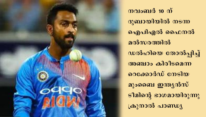 നവംബര് 10 ന് ദുബായിയില് നടന്ന ഐപിഎല് ഫൈനല് മല്സരത്തില് ഡല്ഹിയെ തോല്പ്പിച്ച് അഞ്ചാം കിരീടമെന്ന റെക്കോര്ഡ് നേടിയ മുംബൈ ഇന്ത്യന്സ് ടീമിന്റെ ഭാഗമായിരുന്നു ക്രുനാല് പാണ്ഡ്യ. ഐപിഎല് 2020ല് 109 റണ്സ് നേടിയ ക്രുനാല് 16 മല്സരങ്ങളില് നിന്ന് ആറ് വിക്കറ്റുകളും നേടിയിരുന്നു. ഐപിഎല്ലില് മുംബൈ ഇന്ത്യന്സിനായി 71 മല്സരങ്ങളാണ് കളിച്ചത്. മാത്രമല്ല, ഐപിഎല് 2017 ഫൈനലില് മാന് ഓഫ് ദി മാച്ചായിരുന്നു.