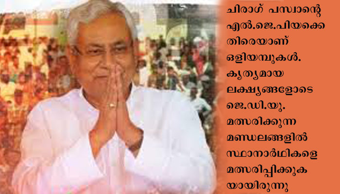 ചിരാഗ് പസ്വാന്റെ എല്‍.ജെ.പിയക്കെതിരെയാണ് ഒളിയമ്പുകൾ. കൃത്യമായ ലക്ഷ്യങ്ങളോടെ ജെ.ഡി.യു. മത്സരിക്കുന്ന മണ്ഡലങ്ങളില്‍ സ്ഥാനാര്‍ഥികളെ മത്സരിപ്പിക്കുകയായിരുന്നു. ഇതോടെ വോട്ടുകള്‍ ഭിന്നിപ്പിക്കാൻ കഴിഞ്ഞെന്നും നിതീഷ് പറഞ്ഞു. മുഖ്യമന്ത്രിയാകാൻ അവകാശവാദം ഉന്നയിച്ചിട്ടില്ലെന്നും