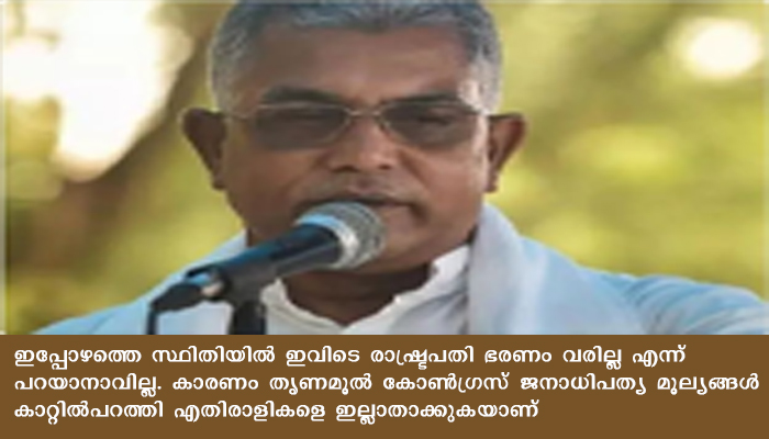 ഞങ്ങളുടെ പാര്ട്ടിക്ക് ഭരണഘടനയില് വിശ്വാസമുണ്ട്. തെരഞ്ഞെടുക്കപ്പെട്ട സര്ക്കാരിനെ ഞങ്ങള് വീഴ്ത്താറില്ല. നേരത്തെ തന്നെ അമിത് ഷാ ഇത് വ്യക്തമാക്കിയതാണ്. ഈ സര്ക്കാരിനെ ഞങ്ങള് തെരഞ്ഞെടുപ്പില് നേരിടും. മമതയുടെ സര്ക്കാരിന്റെ വീഴ്ച്ചകള് ഗവര്ണറാണ് കേന്ദ്രത്തില് റിപ്പോര്ട്ട് ചെയ്യുകയെന്നും ദിലീപ് ഘോഷ് വ്യക്തമാക്കി. ഇപ്പോഴത്തെ സ്ഥിതിയില് ഇവിടെ രാഷ്ട്രപതി ഭരണം വരില്ല എന്ന് പറയാനാവില്ല. കാരണം തൃണമൂല് കോണ്ഗ്രസ് ജനാധിപത്യ മൂല്യങ്ങള് കാറ്റില്പറത്തി എതിരാളികളെ ഇല്ലാതാക്കുകയാണ്. തനിക്കെതിരെ മാത്രം 40 കള്ളക്കേസുകള് ഉണ്ടെന്നും ഘോഷ് പറഞ്ഞു.