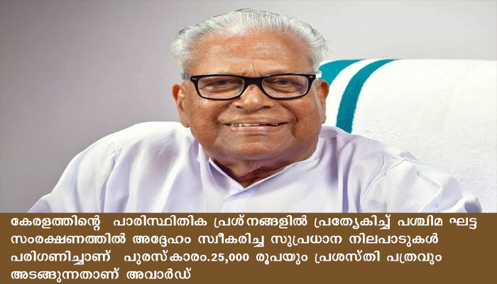 ഡോ.കമറുദ്ദീന്‍ സ്മാരക പരിസ്ഥിതി പുരസ്‌കാരം വിഎസ് അച്ചുതാനന്ദന്