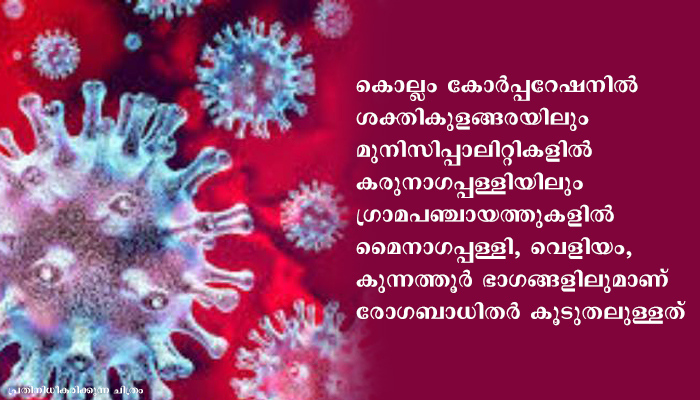 കൊല്ലം കോര്‍പ്പറേഷനില്‍ 86 പേര്‍ക്കാണ് രോഗബാധ. ശക്തികുളങ്ങര 9, മുണ്ടയ്ക്കല്‍ ഈസ്റ്റ് 8, കാവനാട് 6, പള്ളിമുക്ക്, മങ്ങാട്, മുണ്ടയ്ക്കല്‍ വെസ്റ്റ് എന്നിവിടങ്ങളില്‍ അഞ്ചുവീതവും തിരുമുല്ലാവാരം 4, വാളത്തുംഗല്‍, കല്ലുംതാഴം,ചാത്തിനാംകുളം, തൃക്കടവൂര്‍, പുളിയത്ത്മുക്ക് പ്രദേശങ്ങളില്‍ മൂന്നു വീതവുമാണ് കോര്‍പ്പറേഷന്‍ പരിധിയിലെ രോഗബാധിതര്‍.മുനിസിപ്പാലിറ്റികളില്‍ കരുനാഗപ്പള്ളി 9, പുനലൂര്‍ 8, കൊട്ടാരക്കര 8 എന്നിങ്ങനെയാണ് രോഗബാധിതരുള്ളത്.