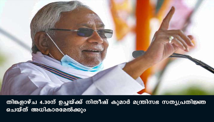 പട്ന: ബിഹാർ മുഖ്യമന്ത്രിയായി നിതീഷ് കുമാർ നവംബർ 16 തിങ്കളാഴ്ച സത്യപ്രതിജ്ഞ ചെയ്യും . മുതിര്ന്ന ബിജെപി നേതാവ് രാജ്നാഥ് സിംഗിന്റെ നേതൃത്വത്തില് ഞായറാഴ്ച (15/11/2020) പട്നയില് ചേര്ന്ന എന്ഡിഎ യോഗത്തില് നിതീഷ് കുമാറിനെ എന്ഡിഎ നിയമസഭാ കക്ഷി നേതാവായി തെരഞ്ഞെടുത്തതോടെയാണ് നാലാം തവണയും ബിഹാറിന്റെ മുഖ്യമന്ത്രി സ്ഥാനത്തേക്ക് നിതീഷ് കുമാര് എത്തുന്നത്. തിങ്കളാഴ്ച 4.30ന് ഉച്ചയ്ക്ക് നിതീഷ് കുമാര് മന്ത്രിസഭ സത്യപ്രതിജ്ഞ ചെയ്ത് അധികാരമേല്ക്കും.