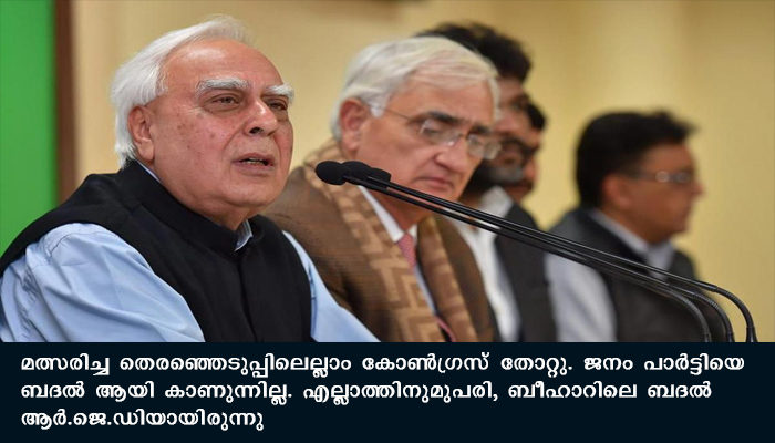 ന്യൂഡൽഹി: ബീഹാറിലെ തോൽവിയുടെ പശ്ചാത്തലത്തിൽ കോൺഗ്രസ്സ് നേതൃത്വത്തെ നിശിതമായി വിമർശിച്ച് കപിൽ സിബൽ . കോൺഗ്രസിനെ ഒരു ബദലായി ഇന്ത്യൻ ജനത ഇന്ന് കണക്കാക്കുന്നില്ലെന്ന് അദ്ദേഹം പറഞ്ഞു. ഒരു ദേശീയ മാധ്യമത്തോടു സംസാരിക്കുകയായിരുന്നു അദ്ദേഹം.