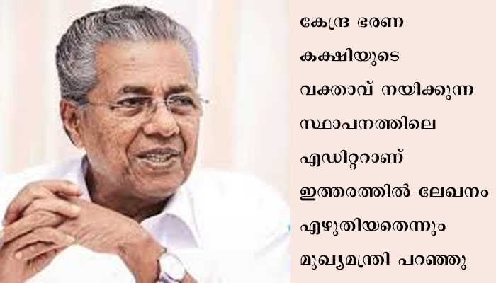 തിരുവനന്തപുരം: സർക്കാരിനെതിരെ മാധ്യമങ്ങൾ കള്ളപ്രചാരണം നടത്തുന്നുവെന്ന് മുഖ്യമന്ത്രി പിണറായി വിജയൻ. കേരളത്തിലെ പ്രധാന മാധ്യമത്തിലെ എഡിറ്റർ ഇൻ ചീഫ്, ദേശീയ മാധ്യമങ്ങളിൽ സർക്കാരിനെതിരെ ലേഖനം എഴുതി. കേന്ദ്ര ഭരണ കക്ഷിയുടെ വക്താവ് നയിക്കുന്ന സ്ഥാപനത്തിലെ എഡിറ്ററാണ് ഇത്തരത്തിൽ ലേഖനം എഴുതിയതെന്നും മുഖ്യമന്ത്രി പറഞ്ഞു.