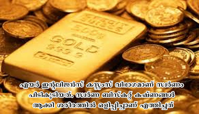 സ്വര്ണ ബിസ്കറ്റ് കഷ്ണങ്ങള് ആക്കി ശരീരത്തില് ഒളിപ്പിച്ചാണ് എത്തിച്ചത്.