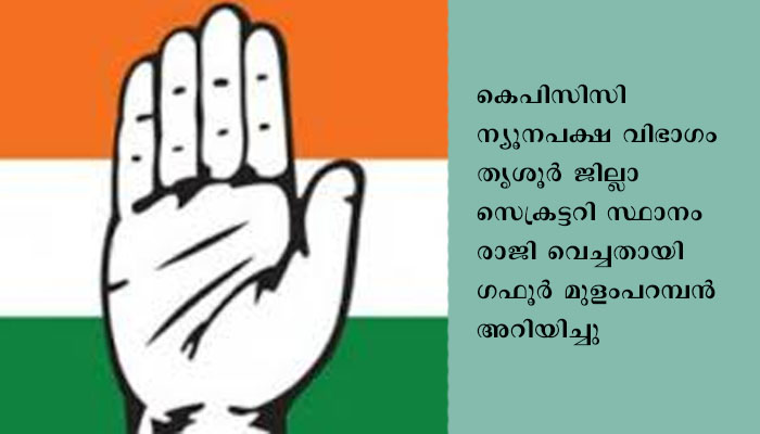 മാള: കെപിസിസി ന്യൂനപക്ഷ വിഭാഗം തൃശൂര് ജില്ലാ സെക്രട്ടറി സ്ഥാനം രാജി വെച്ചതായി ഗഫൂര് മുളംപറമ്പന് അറിയിച്ചു.