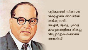 തിരുവനന്തപുരം: പട്ടികജാതി – പട്ടികവർഗ്ഗ ക്ഷേമ പ്രവർത്തനങ്ങൾ സംബന്ധിച്ച മികച്ച റിപ്പോർട്ടിനുള്ള ഡോ. ബി. ആർ. അംബേദ്കർ മാധ്യമ അവാർഡിന് അപേക്ഷ ക്ഷണിച്ചു. പട്ടികജാതി വികസന വകുപ്പാണ് അവാർഡ് നൽകുന്നത്. അച്ചടി, ദൃശ്യ, ശ്രവ്യ മാധ്യമങ്ങളിലെ മികച്ച റിപ്പോർട്ടുകൾക്കാണ് അവാർഡ്.