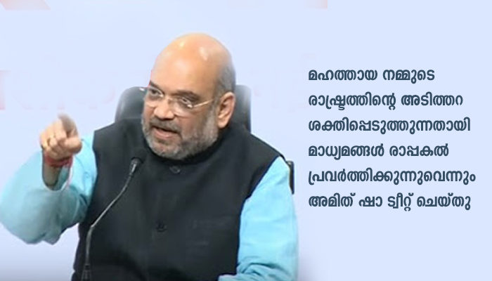 കൊറോണക്കാലത്ത് നമ്മുടെ മാധ്യമങ്ങള് നിര്വ്വഹിച്ച പങ്കിനെ അഭിനന്ദിക്കുന്നു. മഹത്തായ നമ്മുടെ രാഷ്ട്രത്തിന്റെ അടിത്തറ ശക്തിപ്പെടുത്തുന്നതായി മാധ്യമങ്ങള് രാപ്പകല് പ്രവര്ത്തിക്കുന്നുവെന്നും അമിത് ഷാ ട്വീറ്റ് ചെയ്തു.