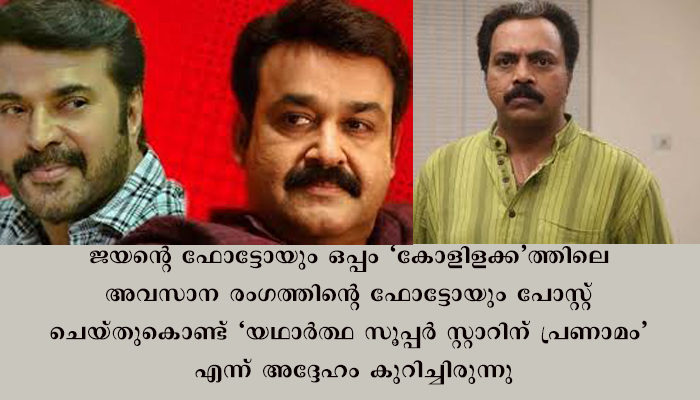 ജയൻ്റെ നാൽപതാം ചരമവാർഷികത്തിൽ പ്രണാമം അർപ്പിച്ചുകൊണ്ട് അദ്ദേഹം ഫേസ്ബുക്കിലിട്ട ഒരു പോസ്റ്റിന് കീഴിലെ കമന്റിലാണ് ഇക്കാര്യം വ്യക്തമാക്കിയത്. ജയന്റെ ഫോട്ടോയോയും ഒപ്പം ‘കോളിളക്ക’ത്തിലെ അവസാന രംഗത്തിന്റെ ഫോട്ടോയോയും പോസ്റ്റ് ചെയ്തുകൊണ്ട് ‘യഥാർത്ഥ സൂപ്പർ സ്റ്റാറിന് പ്രണാമം’ എന്ന് അദ്ദേഹം കുറിച്ചിരുന്നു.