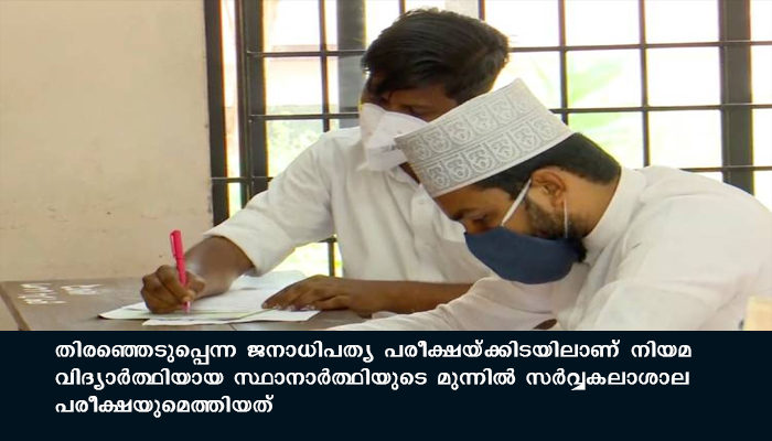 ഒരേ സമയം രണ്ട് പരീക്ഷകളെ നേരിടുകയാണ് തലശേരി നഗരസഭയിലെ അൻപതാം വാർഡിൽ നിന്നും മത്സരിക്കുന്ന എൽ.ഡി.എഫ് സ്ഥാനാർത്ഥി എം.കെ ഹസൻ. തിരഞ്ഞെടുപ്പെന്ന ജനാധിപത്യ പരീക്ഷയ്ക്കിടയിലാണ് നിയമ വിദ്യാർത്ഥിയായ സ്ഥാനാർത്ഥിയുടെ മുന്നിൽ സർവ്വകലാശാല പരീക്ഷയുമെത്തിയത്.