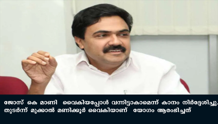 5 മണിക്ക് തീരുമാനിച്ചിരുന്ന പരിപാടിയില് സിപിഐ സംസ്ഥാന സെക്രട്ടറി കാനം രാജേന്ദ്രനും, സിപിഎം, സിപിഐ ജില്ലാ സെക്രട്ടറിമാരടക്കം സമയത്തെത്തിയിരുന്നു. ജോസ് കെ മാണി വൈകിയപ്പോള് വന്നിട്ടാകാമെന്ന് കാനം നിര്ദ്ദേശിച്ചു. തുടര്ന്ന് മുക്കാല് മണിക്കൂര് വൈകിയാണ് യോഗം ആരംഭിച്ചത്.