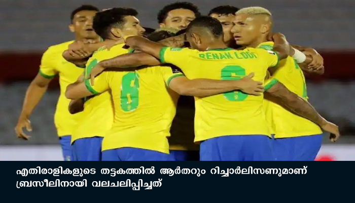 എതിരാളികളുടെ തട്ടകത്തില് ആര്തറും റിച്ചാര്ലിസണുമാണ് ബ്രസീലിനായി വലചലിപ്പിച്ചത്. ഇരു ടീമുകളിലും രണ്ട് സൂപ്പര്താരങ്ങളുടെ അഭാവമുണ്ടായിരുന്നു. പരിക്കേറ്റ സൂപ്പര്താരം നെയ്മറില്ലാതെ ബ്രസീലും കോവിഡ് ബാധിതനായ ലൂയി സുവാരസില്ലാതെ യുറുഗ്വായ്യും കളത്തിലിറങ്ങി.