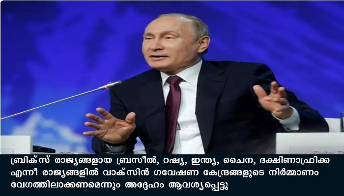 മോസ്‌കോ: റഷ്യയുടെ കോവിഡ് പ്രതിരോധ വാക്‌സിനായ സ്പുട്‌നിക് 5 ഇന്ത്യയിലും ചൈനയിലും ഉത്പാദിപ്പിക്കാന്‍ ആലോചിക്കുന്നുവെന്ന് റഷ്യന്‍ പ്രസിഡന്റ് വ്‌ളാദിമിര്‍ പുടിന്‍. ബ്രിക്‌സ് രാജ്യങ്ങളായ ബ്രസീല്‍, റഷ്യ, ഇന്ത്യ, ചൈന, ദക്ഷിണാഫ്രിക്ക എന്നീ രാജ്യങ്ങളില്‍ വാക്‌സിന്‍ ഗവേഷണ കേന്ദ്രങ്ങളുടെ നിർമ്മാണം വേഗത്തിലാക്കണമെന്നും അദ്ദേഹം ആവശ്യപ്പെട്ടു.
