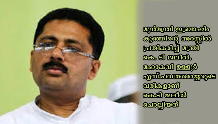 തിരുവനന്തപുരം: മുൻമന്ത്രി ഇബ്രാഹിം കുഞ്ഞിന്റെ അറസ്റ്റിൽ പ്രതികരിച്ച് മന്ത്രി കെ. ടി ജലീൽ. മഹാകവി ഉള്ളൂർ എസ്.പരമേശ്വരയ്യരുടെ വരികളാണ് കെ.ടി ജലീൽ ചൊല്ലിയത്.