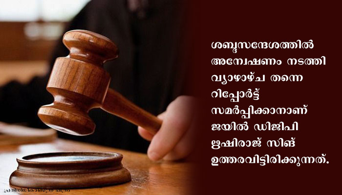 ശബ്ദസന്ദേശത്തില് അന്വേഷണം നടത്തി വ്യാഴാഴ്ച തന്നെ റിപ്പോര്ട്ട് സമര്പ്പിക്കാനാണ് ജയില് ഡിജിപി ഋഷിരാജ് സിങ് ഉത്തരവിട്ടിരിക്കുന്നത്.