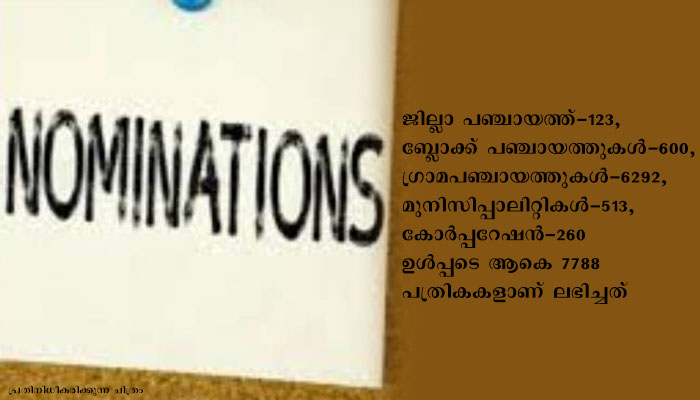 കൊല്ലം: ജില്ലയില് ഡിസംബര് എട്ടിന് നടക്കുന്ന തദ്ദേശ സ്വയംഭരണ സ്ഥാപന തിരഞ്ഞെടുപ്പുമായി ബന്ധപ്പെട്ട് ഇന്നലെ(നവംബര് 18 ) വരെ 7788 പത്രികകളാണ് ലഭിച്ചത്. ജില്ലാ പഞ്ചായത്ത്-123, ബ്ലോക്ക് പഞ്ചായത്തുകള്-600, ഗ്രാമപഞ്ചായത്തുകള്-6292, മുനിസിപ്പാലിറ്റികള്-513, കോര്പ്പറേഷന്-260 ഉള്പ്പടെ ആകെ 7788 പത്രികകളാണ് ലഭിച്ചത്.