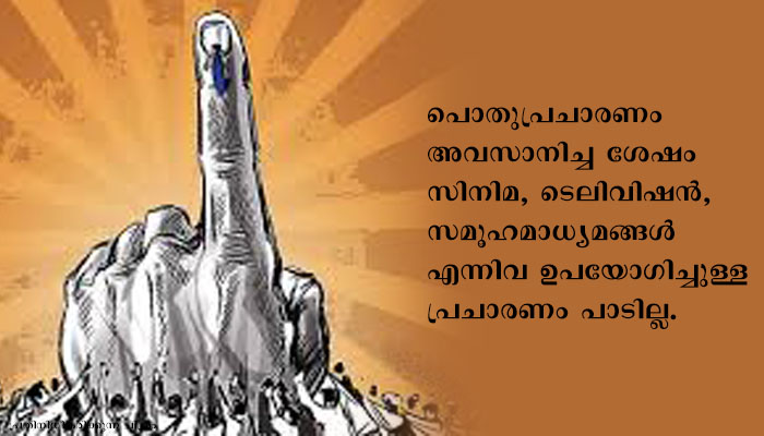 പൊതുപ്രചാരണം അവസാനിച്ച ശേഷം സിനിമ, ടെലിവിഷന്, സമൂഹമാധ്യമങ്ങള് എന്നിവ ഉപയോഗിച്ചുള്ള പ്രചാരണം പാടില്ല.