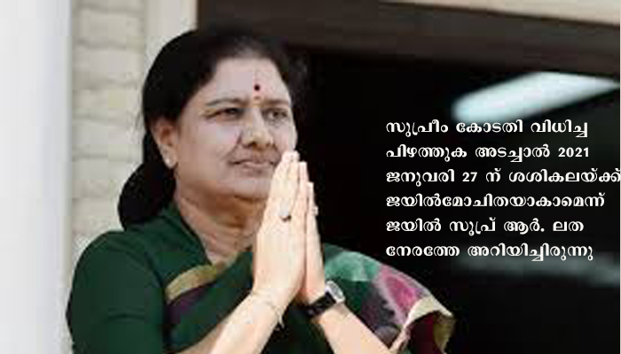 സുപ്രീം കോടതി വിധിച്ച പിഴത്തുക അടച്ചാല് 2021 ജനുവരി 27 ന് ശശികലയ്ക്ക് ജയില്മോചിതയാകാമെന്ന് ജയില് സൂപ്രണ്ട് ആര്. ലത നേരത്തേ അറിയിച്ചിരുന്നു.
