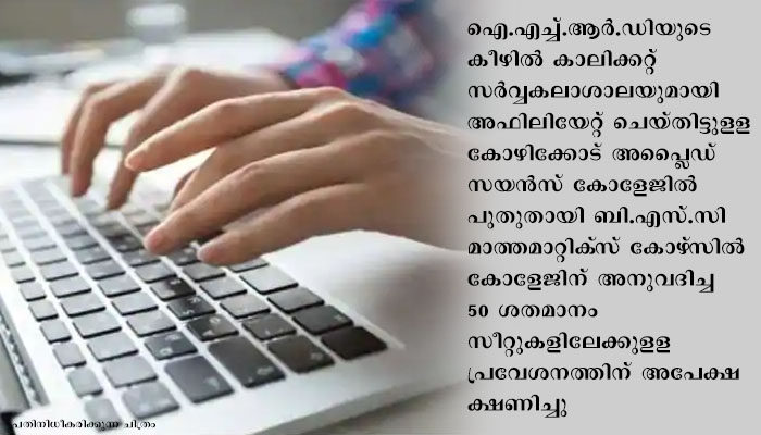 തിരുവനന്തപുരം: ഐ.എച്ച്.ആർ.ഡിയുടെ കീഴിൽ കാലിക്കറ്റ് സർവ്വകലാശാലയുമായി അഫിലിയേറ്റ് ചെയ്തിട്ടുളള കോഴിക്കോട് (0495-2765154, 8547005044), അപ്ലൈഡ് സയൻസ് കോളേജിൽ പുതുതായി ബി.എസ്.സി മാത്തമാറ്റിക്സ് കോഴ്സിൽ കോളേജിന് അനുവദിച്ച 50 ശതമാനം സീറ്റുകളിലേക്കുളള പ്രവേശനത്തിന് അപേക്ഷ ക്ഷണിച്ചു. അപേക്ഷ ഫോറവും പ്രോസ്പെക്റ്റസും www.ihrd.ac.in ൽ ലഭിക്കും. അപേക്ഷാ ഫോറം പൂരിപ്പിച്ച് രജിസ്ട്രേഷൻ ഫീസായി കോളേജ് പ്രിൻസിപ്പാളിന്റെ പേരിൽ മാറാവുന്ന 350 രൂപയുടെ ഡിമാന്റ് ഡ്രാഫ്റ്റ് സഹിതം (പട്ടികജാതി-പട്ടികവർഗ വിഭാഗക്കാർക്ക് 150 രൂപ) അപേക്ഷിക്കാം. തുക കോളേജിൽ നേരിട്ടും അടയ്ക്കാം. വിശദവിവരങ്ങൾക്ക് www.ihrd.ac.in സന്ദർശിക്കുക.