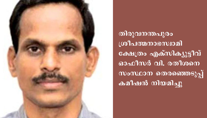 തൃശ്ശൂർ: തദ്ദേശ സ്വയംഭരണ തെരഞ്ഞെടുപ്പിനുള്ള തൃശൂർ ജില്ലയിലെ പൊതുനിരീക്ഷകനായി തിരുവനന്തപുരം ശ്രീപത്മനാഭസ്വാമി ക്ഷേത്രം എക്‌സിക്യുട്ടീവ് ഓഫീസർ വി. രതീശനെ സംസ്ഥാന തെരഞ്ഞെടുപ്പ് കമീഷൻ നിയമിച്ചു.