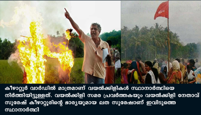 കീഴാറ്റൂർ വാർഡിൽ മാത്രമാണ് വയൽക്കിളികൾ സ്ഥാനാർത്ഥിയെ നിർത്തിയിട്ടുള്ളത്. വയൽക്കിളി സമര പ്രവർത്തകയും വയൽക്കിളി നേതാവ് സുരേഷ് കീഴാറ്റൂരിന്റെ ഭാര്യയുമായ ലത സുരേഷാണ് ഇവിടുത്തെ സ്ഥാനാർത്ഥി. കീഴാറ്റൂരിന്റെ സമീപ വാർഡുകളായ തുളളന്നൂർ, മാന്തംകുണ്ട്, പാലയാട് വാർഡുകളിലാണ് വയൽക്കിളികൾക്ക് സ്വാധീനമുള്ളത്. ഈ വാർഡുകളിൽ പാലയാടൊഴികെ മറ്റ് രണ്ടും സി പി എമ്മിൻ്റെ സിറ്റിംഗ് വാർഡുകളാണ്. പാലയാട് നേർത്ത ഭൂരിപക്ഷത്തിൽ കോൺഗ്രസ് ആണ് ജയിച്ചത്. ഈ മൂന്ന് വാർഡുകളിലും വയൽക്കിളികളുടെ സാന്നിധ്യം UDF സ്ഥാനാർത്ഥികൾക്ക് സഹായകമായേക്കുമെന്നാണ് സൂചന.